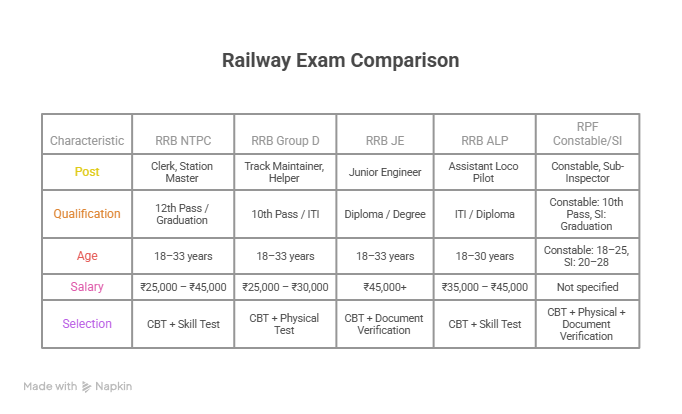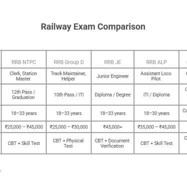 Railway Exam Pattern CBT – 1 Mathematics Reasoning General Science General Awareness / Current Affairs CBT – 2 (Post-wise) Same subjects (Advanced level) Other Tests Physical Efficiency Test (PET) – Group D, RPF Skill Test / CBAT – ALP, NTPC (SM, TA) Railway Syllabus (Brief) Maths Percentage, Ratio, Profit–Loss, SI/CI, Time & Work, Algebra Reasoning Series, Analogy, Coding-Decoding, Puzzle, Syllogism General Science Physics, Chemistry, Biology (10th level) General Awareness History, Geography, Polity, Economy, Current Affairs Railway Exam Process Online Form CBT-1 CBT-2 Skill / Physical Test Document Verification Medical Test Salary (Approx.) Group D: ₹25,000+ NTPC: ₹30,000 – ₹45,000 JE: ₹45,000+ ALP: ₹40,000+ Preparation Time 4–8 Months (Regular Study)