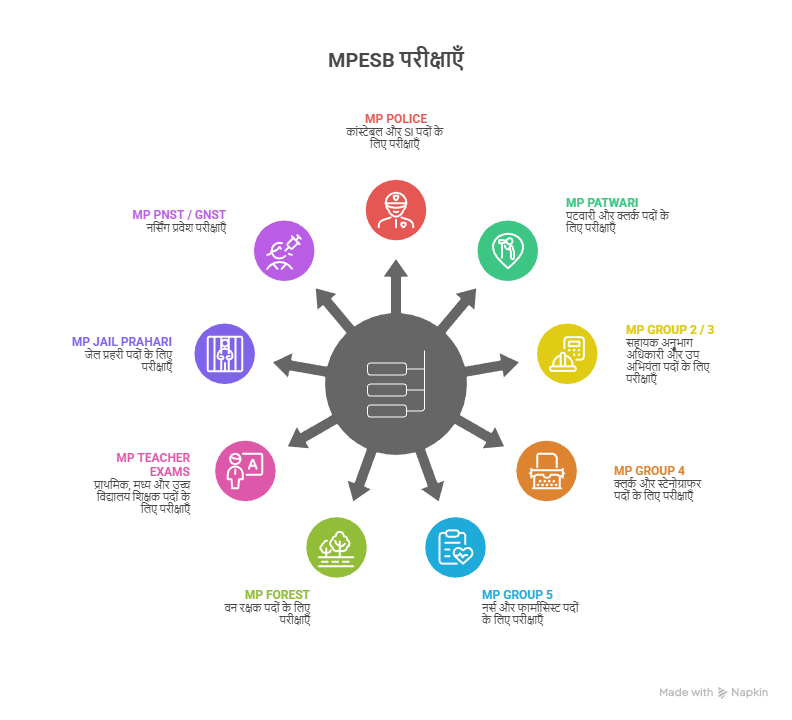 Vyapam Exam Pattern (Common) General Knowledge (MP GK वि शषे ) Maths Reasoning Science Hindi / English Computer (कुछ exams में) MP GK (बहुत जरूरी) MP History MP Geography MP Polity MP Current Affairs Exam Process Online Application Computer Based Test (CBT) Physical / Skill Test (Post-wise) Document Verification.