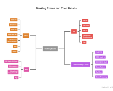 Educational Requirements foe each exam :– Office Assistant Qualification Graduation (Any Stream) Age: 20–30 years (Relaxation as per category) e. SBI (State Bank of India) SBI i. SBI Exams SBI PO ii. SBI Clerk iii. SBI SO Qualification Graduation Age: Clerk: 20–28 years PO: 21–30 years f. RBI (Reserve Bank of India) g. RBI Grade B Officer RBI Assistant Qualification Graduation (Grade B के लि ए अच्छे% जरूरी) Age: 21–30 years h.