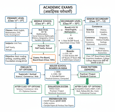 SENIOR SECONDARY (Class 11th – 12th) Streams Science PCM (Physics, Chemistry, Maths) PCB (Physics, Chemistry, Biology) Commerce Accountancy Business Studies Economics Maths (Optional) Arts History Geography Political Science Sociology Economics Class 12th Board Exam Most Important Academic Exam College Admission इसी पर आधारि त होता है Major School Boards in India CBSE ICSE / ISC State Boards (MP Board, UP Board, RBSE आदि ) iv.