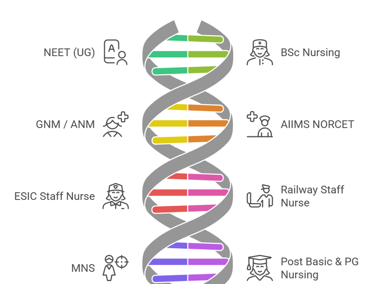 All India Armed Forces Nursing Institutes: Military Nursing Service (MNS) Post: Military Nurse Level: National POST BASIC & PG NURSING EXAMS Post Basic BSc Nursing Qualification: GNM Exams: AIIMS / State / Institute Level MSc Nursing Qualification: BSc Nursing Exams: AIIMS, PGIMER, State Exams Common Nursing Exam Syllabus Nursing Foundation Anatomy & Physiology Microbiology Medical-Surgical Nursing Child Health Nursing Community Health Nursing Mental Health Nursing Nutrition Basic Science Exam Process (General) Online Application Computer Based Test (CBT) Counselling / Interview Document Verification Preparation Time GNM / ANM: 6–8 Months BSc Nursing (NEET): 1 Year Staff Nurse Jobs: 6–10 Months Career Scope After Nursing Staff Nurse (Govt / Private) Nursing Officer Military Nurse Abroad Nursing (After Exam & Experience) Important Nursing Councils Indian Nursing Council (INC) State Nursing Councils